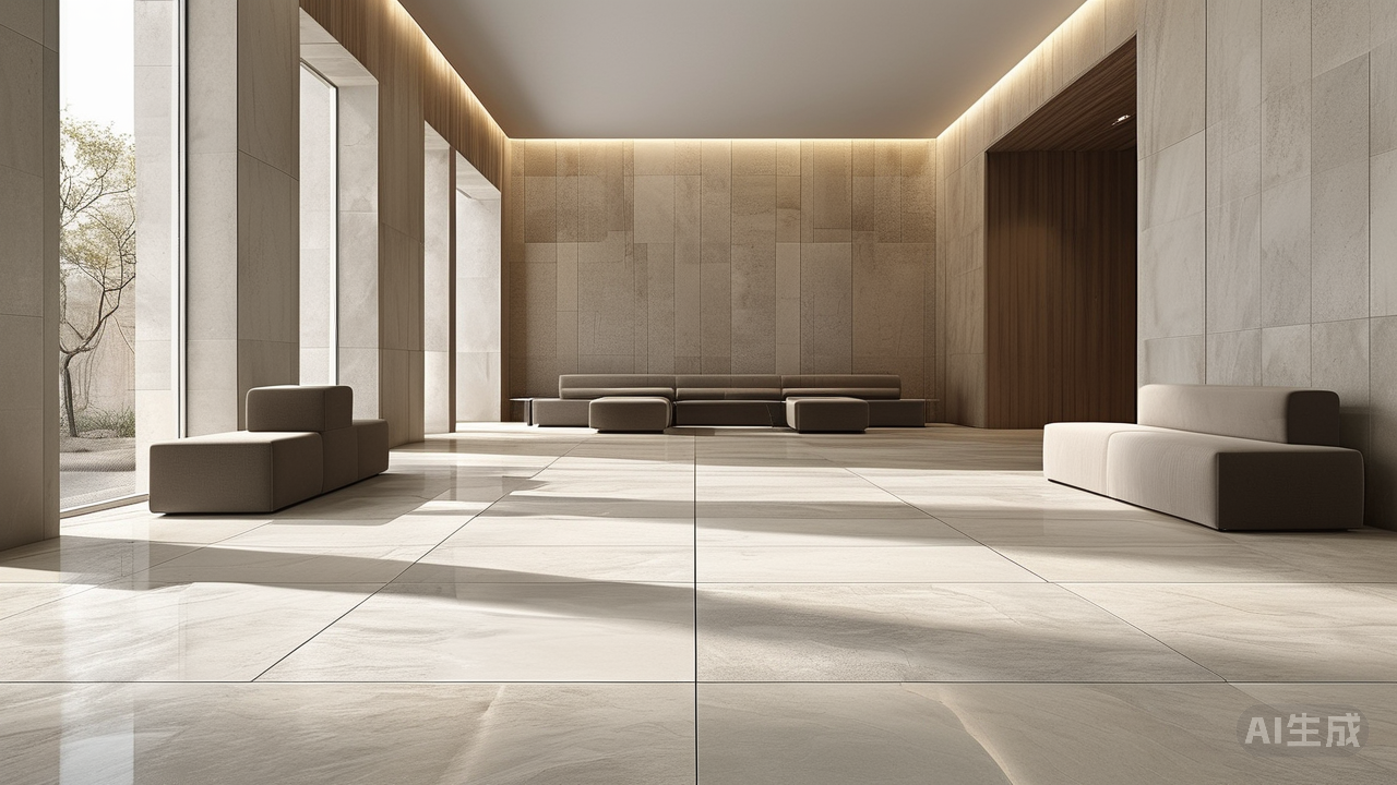 素色哑光砖是永远的安全牌。米白、浅灰、暖咖等低饱和度的色调如同画布般铺陈开来,天然去雕饰的质感恰好呼应了“少即是多”的理念。这类瓷砖表面经过精细磨砂处理,光线照射时产生柔和漫反射,既不会像亮面砖那样造成刺眼眩光,又能巧妙隐藏日常脚印与细微划痕。特别是600x1200mm的大规格款式,通过减少拼缝数量让空间更显开阔连贯,仿佛整个地面就是一块完整的艺术品。