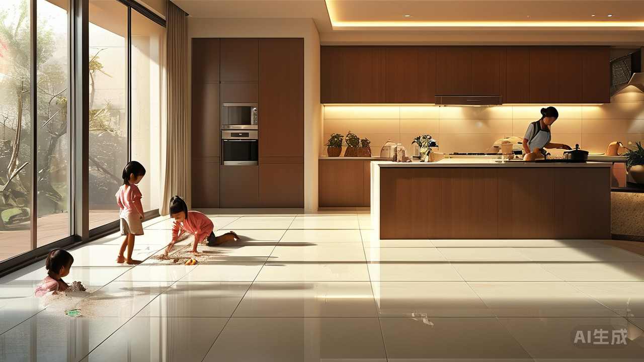 当夜幕降临,灯光洒在这些精美的瓷砖上时,它们又会呈现出另一番迷人的景象。光影交错间,原本就富有层次感的纹理更加立体生动,像是被赋予了生命一般,默默地诉说着属于自己的故事。客厅里,孩子们在上面嬉笑玩耍,感受着脚下传来的踏实与温暖;厨房中,主妇们忙碌的身影倒映其上,每一次转身都能看到生活的烟火气与精致美学相互交融;卧室内,静谧的氛围因那柔和的光晕而更显温馨舒适,助人进入甜美的梦乡。