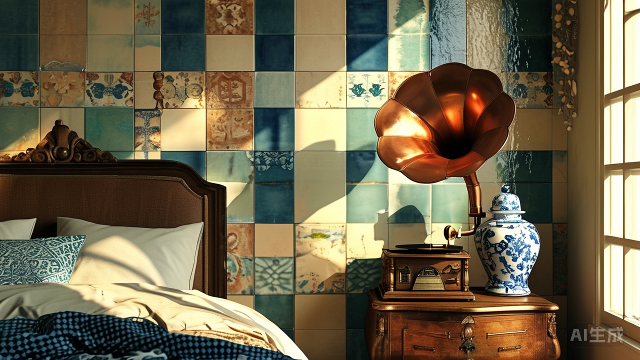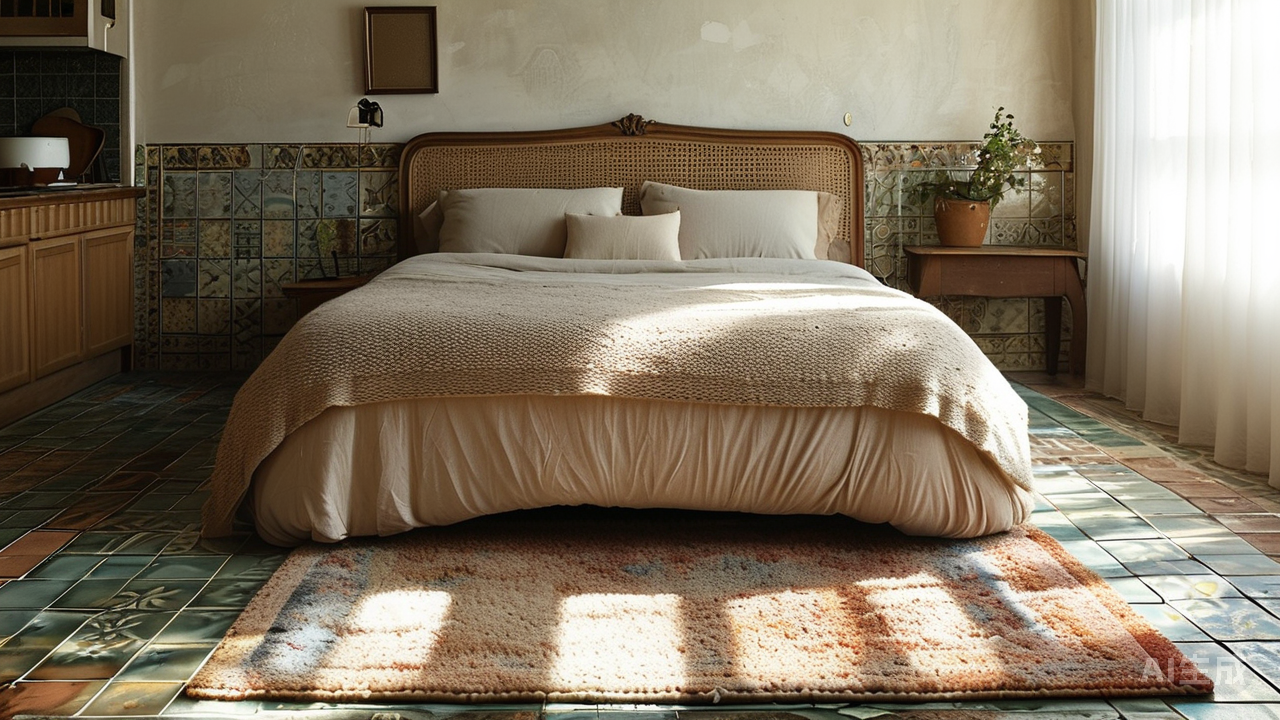 移步至卧室,这里的尊王仿古砖选择了更为柔和的色彩过渡。从床头延伸至窗边的地面,宛如一条流淌着诗意的小径。赤足走在其上,清凉的感觉顺着脚底蔓延开来,驱散疲惫。床边放置一块厚实柔软的地毯,毛茸茸边缘不经意间垂落在砖面上,刚柔并济的组合让休息角落充满温馨惬意。清晨醒来,第一缕阳光透过薄纱窗帘照进室内,映照在略带做旧效果瓷砖上,泛起微微光泽,新的一天便在这充满文艺气息且饱含复古情怀的环境中悠然开启。