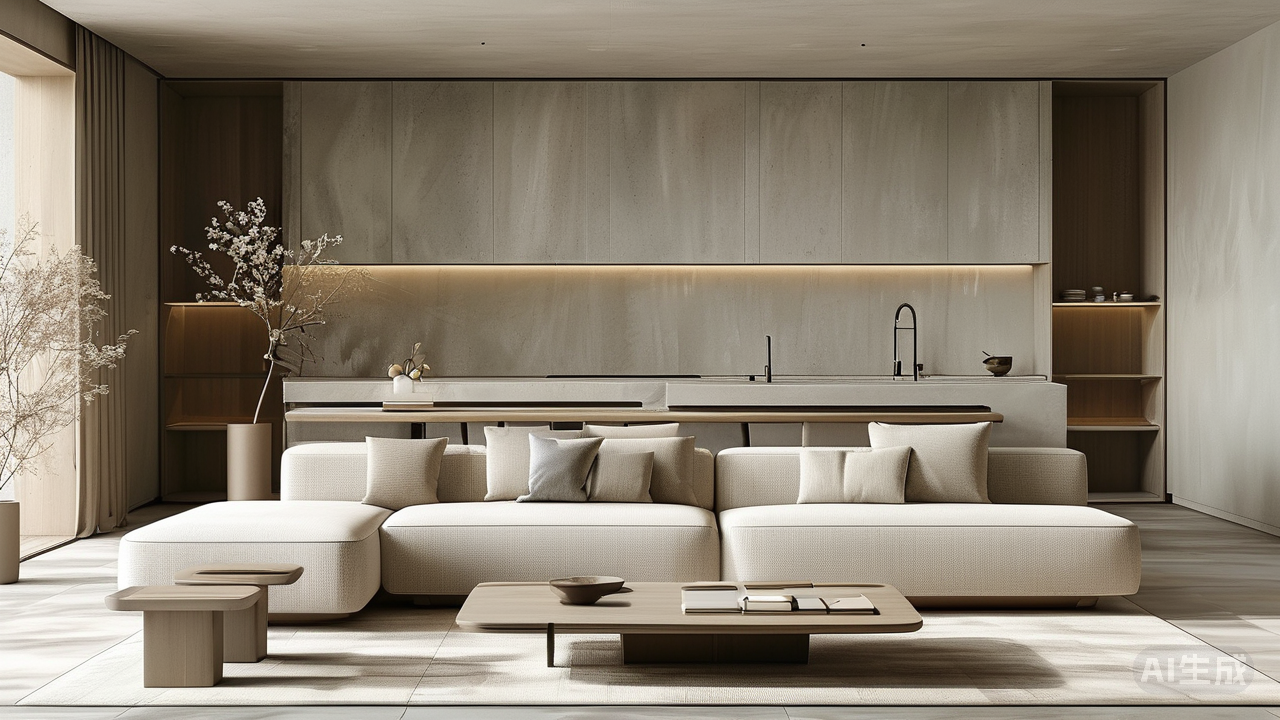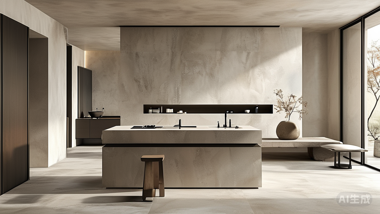 从客厅到卧室,从厨房到浴室,尊王侘寂系列微水泥瓷砖的应用几乎无所不能。在客厅,大面积铺陈能瞬间提升整个空间的敞亮感,搭配简约线条的沙发和几张设计感强烈的茶几,便能打造出一个既时尚又舒适的休闲区域;转入卧室,则换上更为柔和的色调,配合柔软的织物,营造出温馨而又不失格调的私密天地;即便是功能性极强的厨房与浴室,也能通过巧妙的设计,使微水泥瓷砖成为连接实用与美学的桥梁,既耐脏易洁,又不失艺术气息。